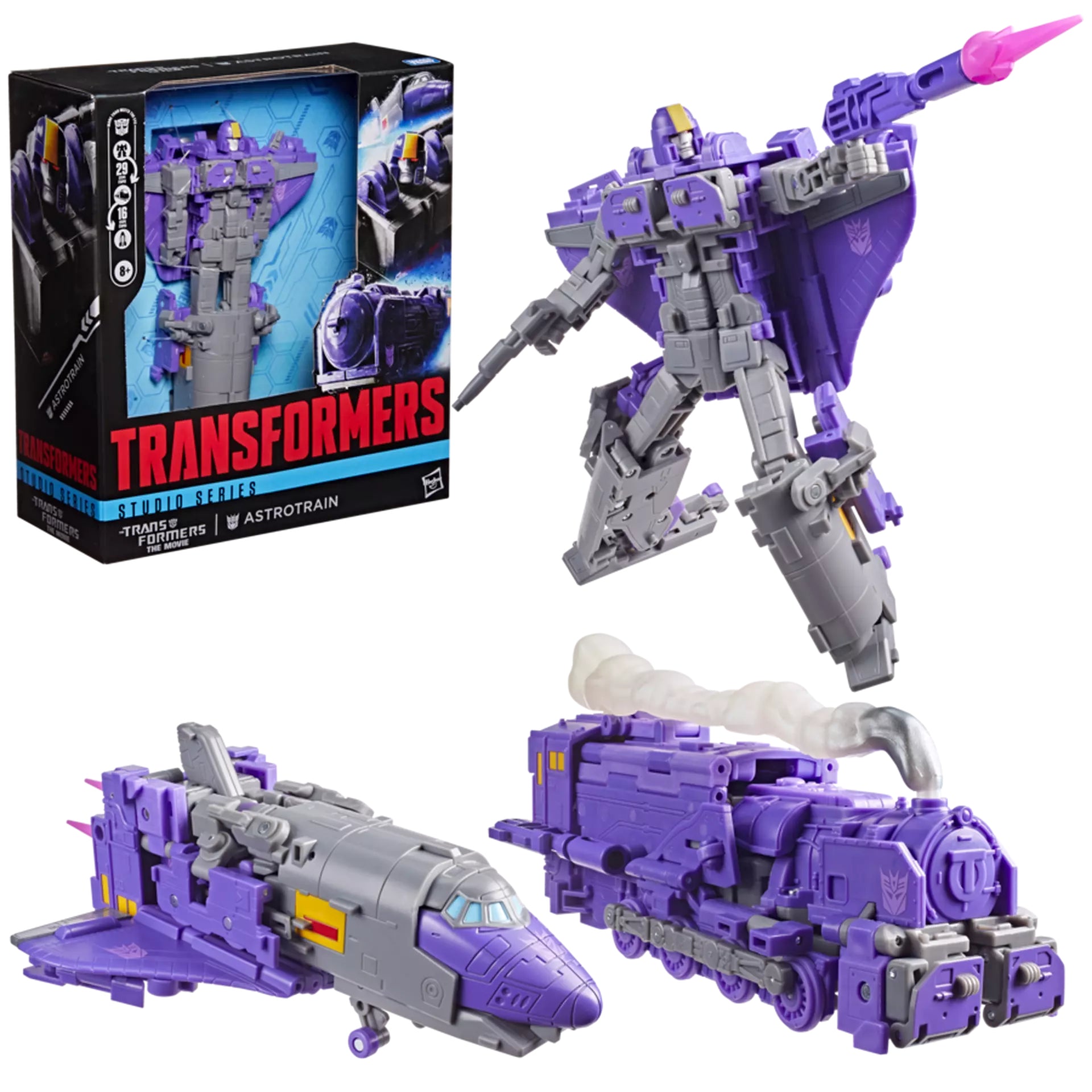 Experience the epic action of The Transformers: The Movie with the Studio Series Astrotrain figure. The 6.75-inch (17 cm) Leader Class figure converts from robot action figure to train mode in 29 steps and from train to space shuttle in 16 steps. With movie-inspired details, intricate poseability, and attachable accessories like blasters, blast effects, and even a trail of smoke for train mode, this Transformers Astrotrain action figure makes an awesome addition to any collection.