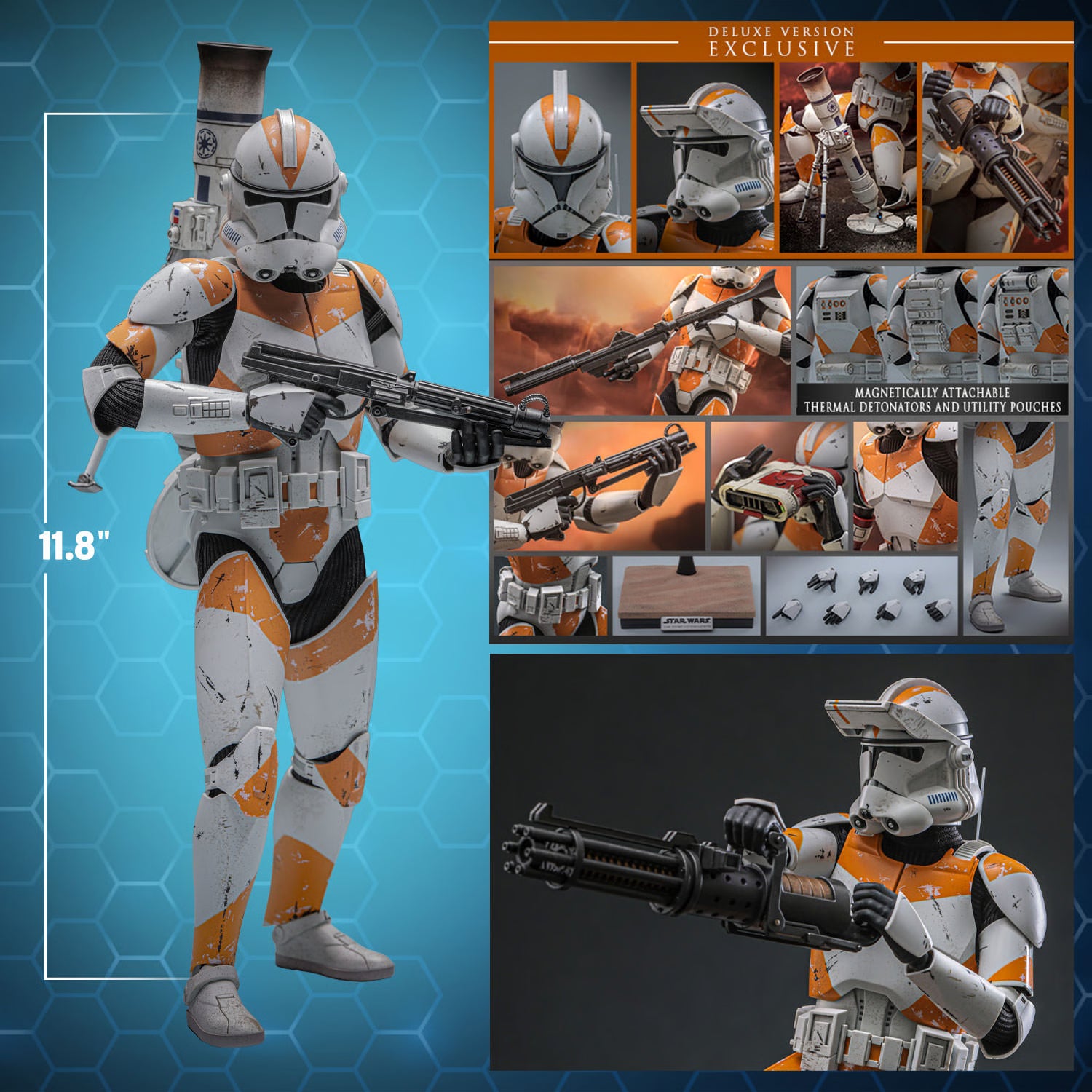 Sideshow and Hot Toys are thrilled to introduce the 212th Attack Battalion Clone Trooper™ Collectible Figure (Deluxe Version) Sixth Scale Figure — a release with additional accessories to enhance display options. This Deluxe Version includes two finely crafted interchangeable helmets, and a set of weathered white armor accented with the unit’s signature orange markings, paired with a utility belt, and boots. To prepare the Clone Trooper for any mission, weapons such as a DC-15A blaster rifle and DC-15S blaster carbine are included. The Deluxe Version also offers extra heavy weaponry, including a Z-6 rotary blaster cannon and a mortar that can be attached to the trooper’s back. In addition to the macrobinoculars, this Deluxe release features helmet macrobinoculars to enhance display options. Accessories includes a couple of newly developed tactical gear that magnetically attaches to the back plate of the trooper’s armor — including thermal detonators, utility pouches, and radio, allowing fans to recreate a wide range of combat-ready displays. With seven interchangeable hands and a specially designed sand-themed figure stand, the trooper is ready to defend the Republic.