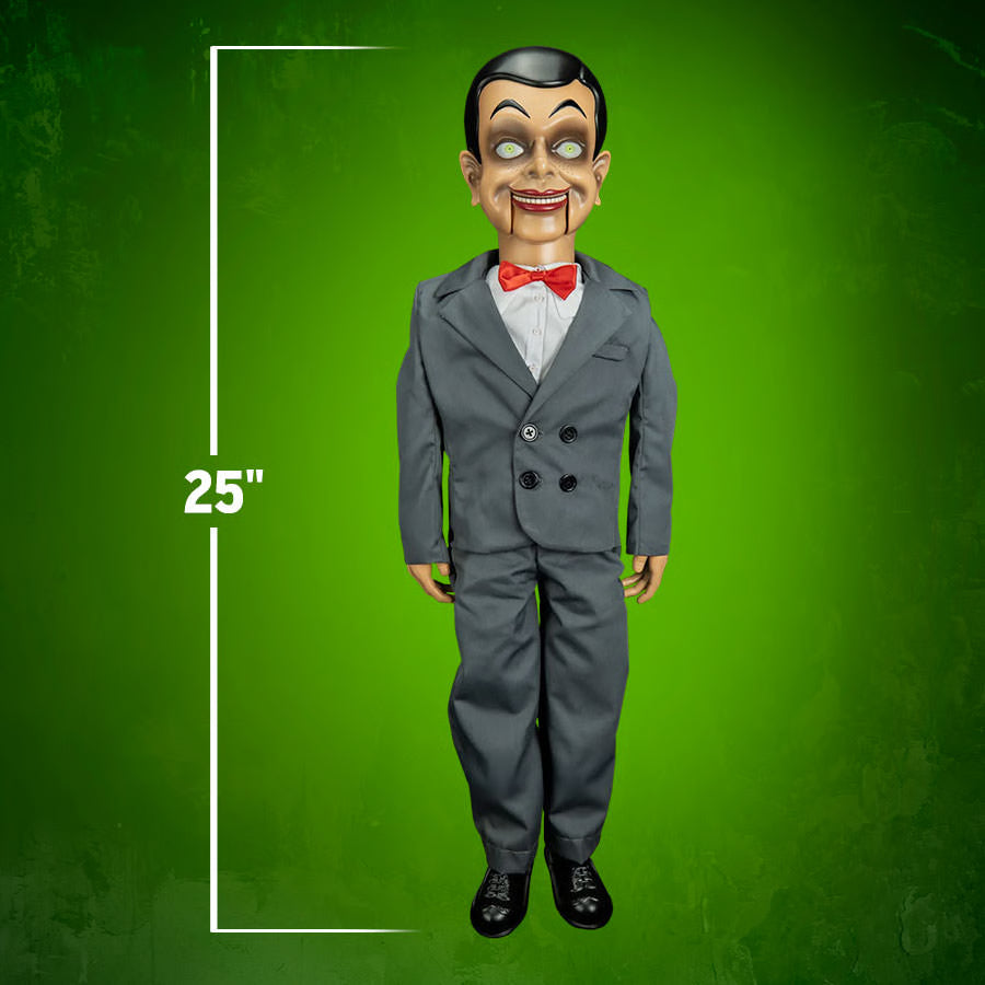 Trick or Treat Studios is proud to present the officially licensed Goosebumps Slappy Dummy Prop Replica, a detailed replica of the most infamous ventriloquist dummy in YA horror history. Twenty-five inches tall and eight inches wide at the shoulders, this full-sized Slappy is designed to haunt your shelf, your display case, or your next haunted house setup. This Slappy is a fully functional ventriloquist dummy! His moveable mouth and lifelike design make him feel like he’s straight out of the Goosebumps books.