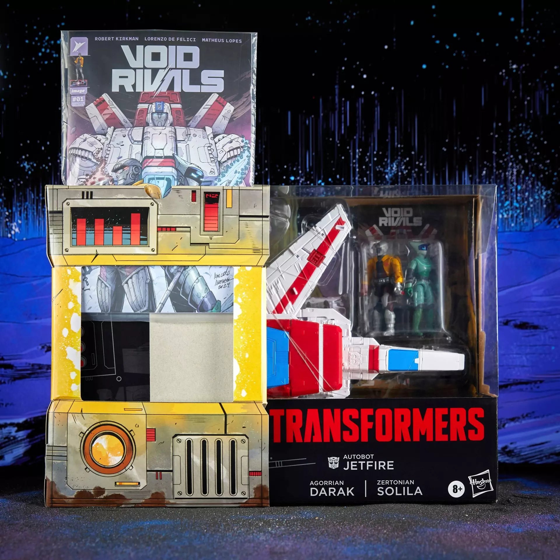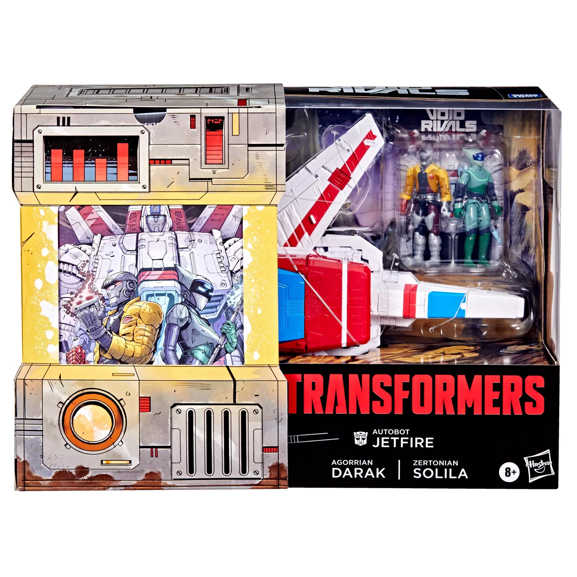 EX-CC-40090Inspired by the comic series that started the Energon universe. The 11-inch (27 cm) Autobot Jetfire action figure converts between robot and jet modes in 32 steps and comes with 3.75-inch (9.5 cm) Zertonian Solila and Agorrian Darak non-converting action figures. All 3 figures have articulated heads, arms, and legs for action poses. The pack includes a Void Rivals comic with collectible variant cover art.
