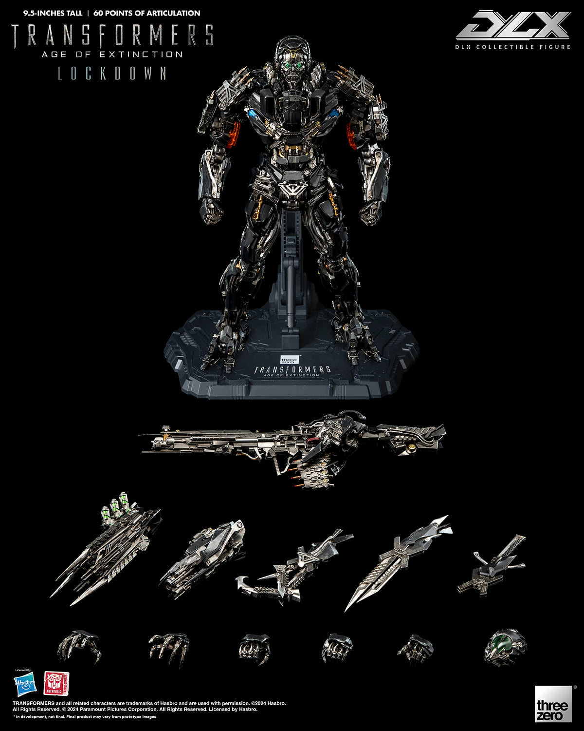 Standing approximately 9.5 inches (~24cm) tall, Transformers: Age of Extinction DLX Lockdown has approximately 60 points of articulation and features die-cast metal parts with an engineering-grade plastics frame, which allows for a dynamic range of poseability, durability, and excellent stability. DLX Lockdown features an incredibly detailed sculpt with threezero’s signature weathered paint application in order to replicate the appearance as seen in the movie, numerous weapon accessories grant the ability to recreate various battle scenes.