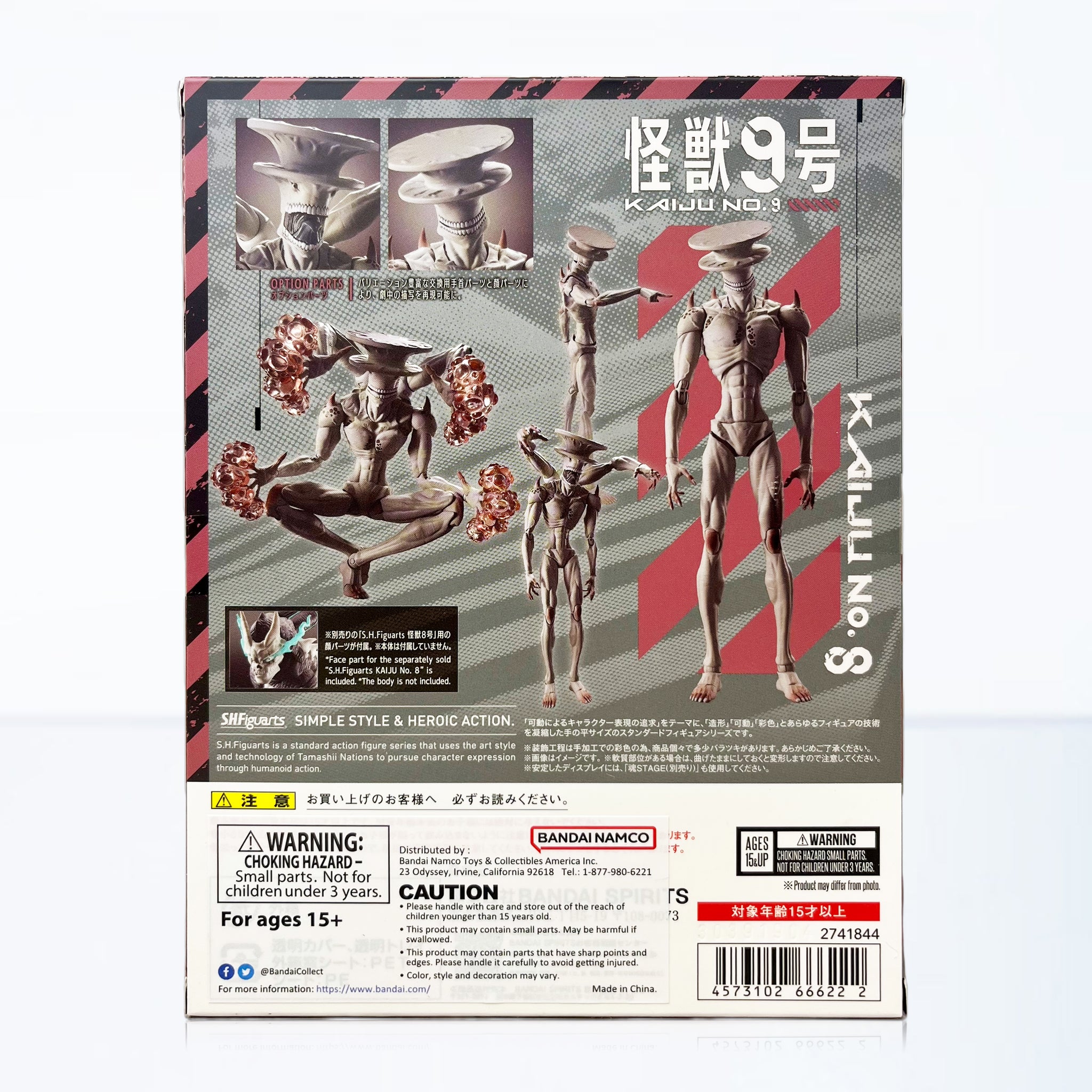 Kaiju No. 9 is recreated in detail based on the scenes in the show. A variety of optional parts are inclluded to recreate various scenes. It includes 3 interchangeable heads, 8 pairs of interchangeable hands, interchangeable effect parts: 4 types of wrists (left and right), and a replacement back parts set. Facial expression parts for the Kaiju No. 8 S.H.Figuarts Action Figure (sold separately) are also included.