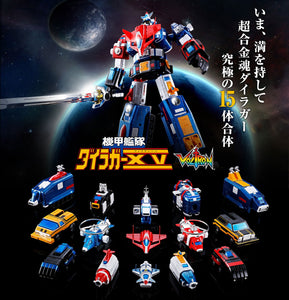 Fifteen vehicles combine into one massive robot! A long-awaited Soul of Chogokin edition of the globally popular super robot, it faithfully forms into the three Air, Land, and Sea Team combat modes as well as the towering Dairugger XV!