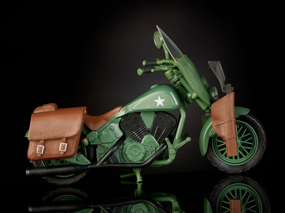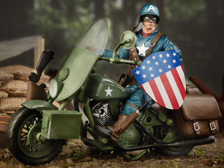 KEN-01-10039Steve Rogers, better known as Captain America, rides his vintage motorcyle into battle. Captain America comes equipped with his trusty shield, a pistol, a knife, and a machine gun; and the motorcycle features removable saddlebags.