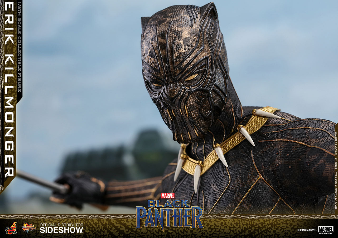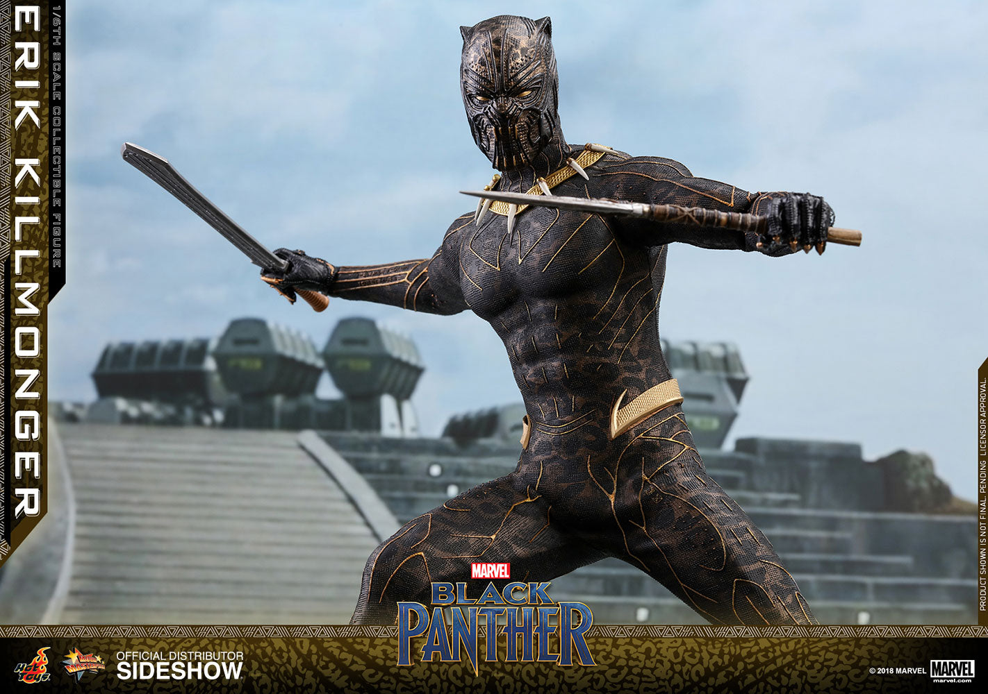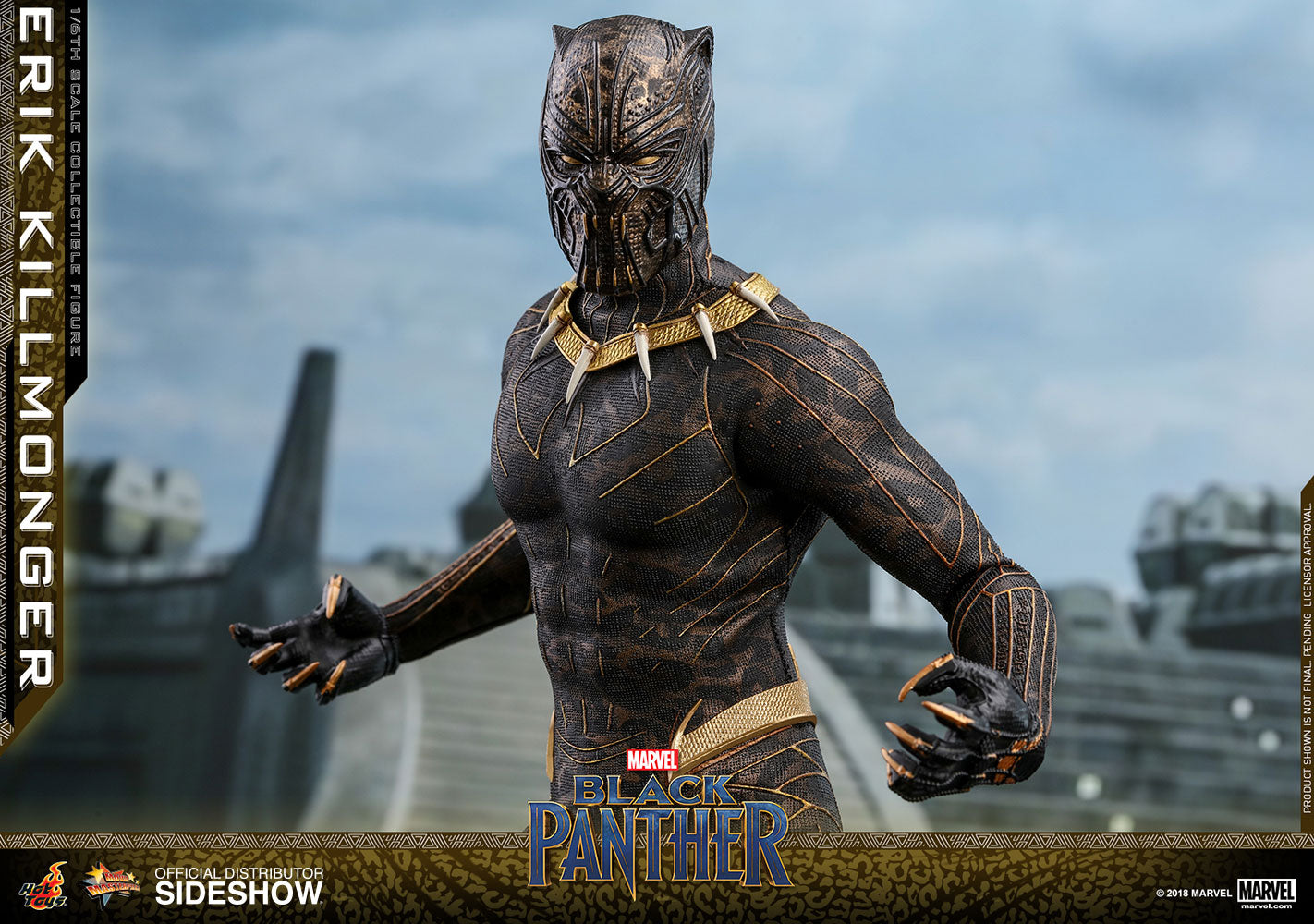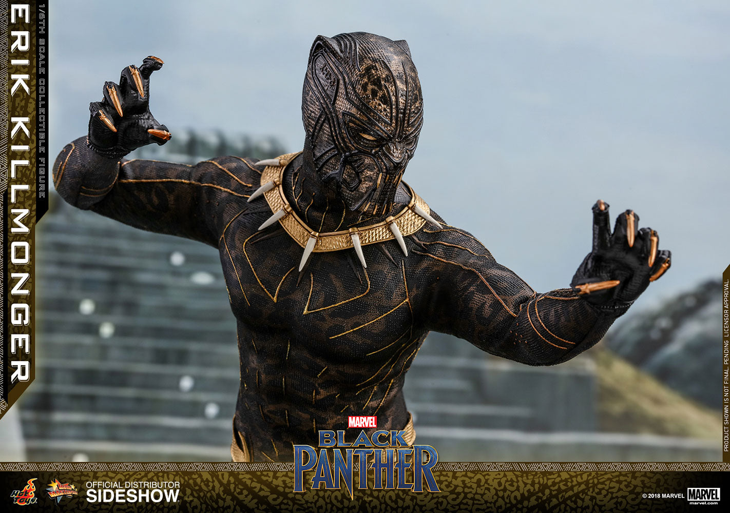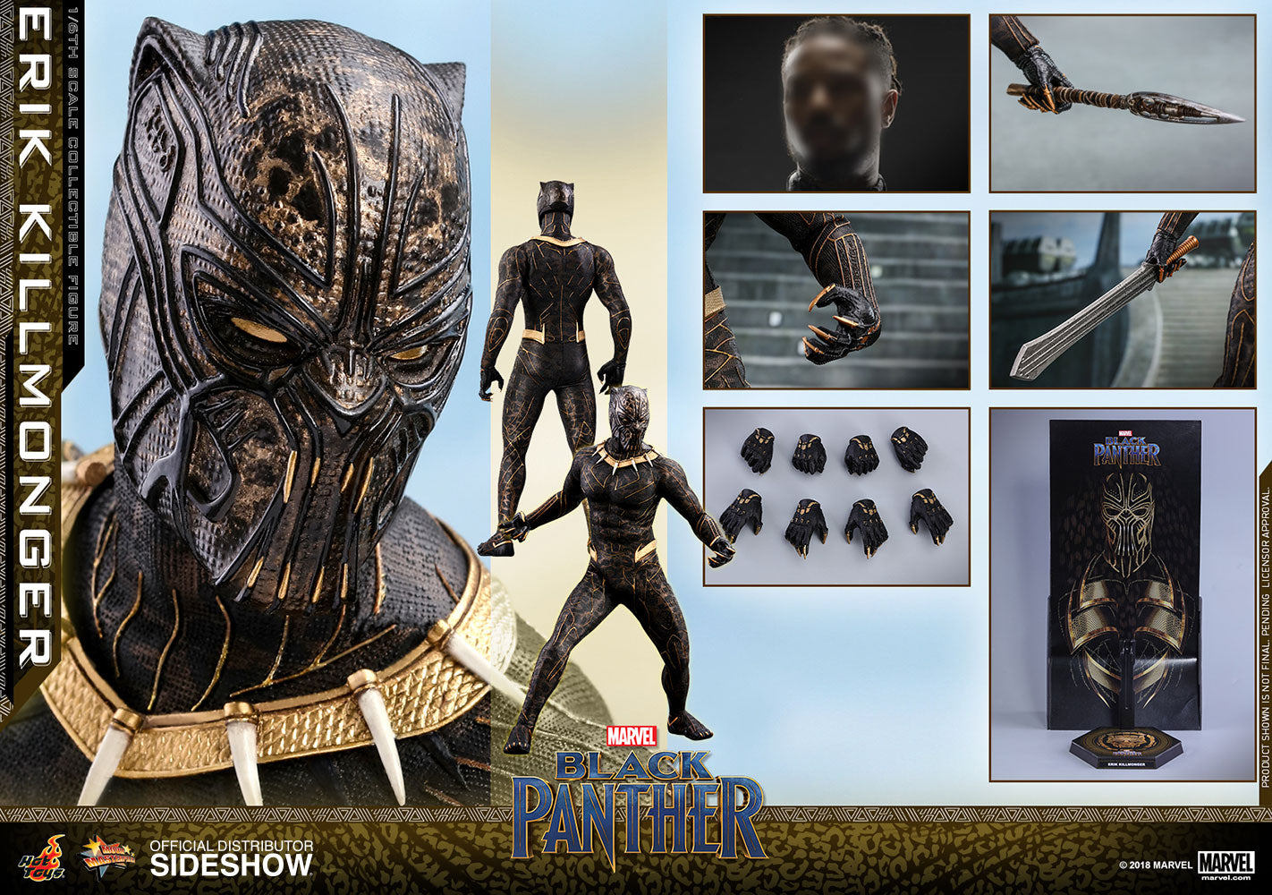 The screenaccurate collectible figure is specially crafted based on the appearance of Michael B. Jordan as Erik Killmonger in the film featuring two interchangeable heads which include a newly sculpted unmasked head sculpt with authentic likeness and all-new masked head with fangs and highly detailed textures, a newly developed muscular body, skillfully tailored Golden Jaguar suit with remarkable tailoring and golden accents, detail recreation of Erik Killmongers weapons, and a specially designed movie-themed figure stand!