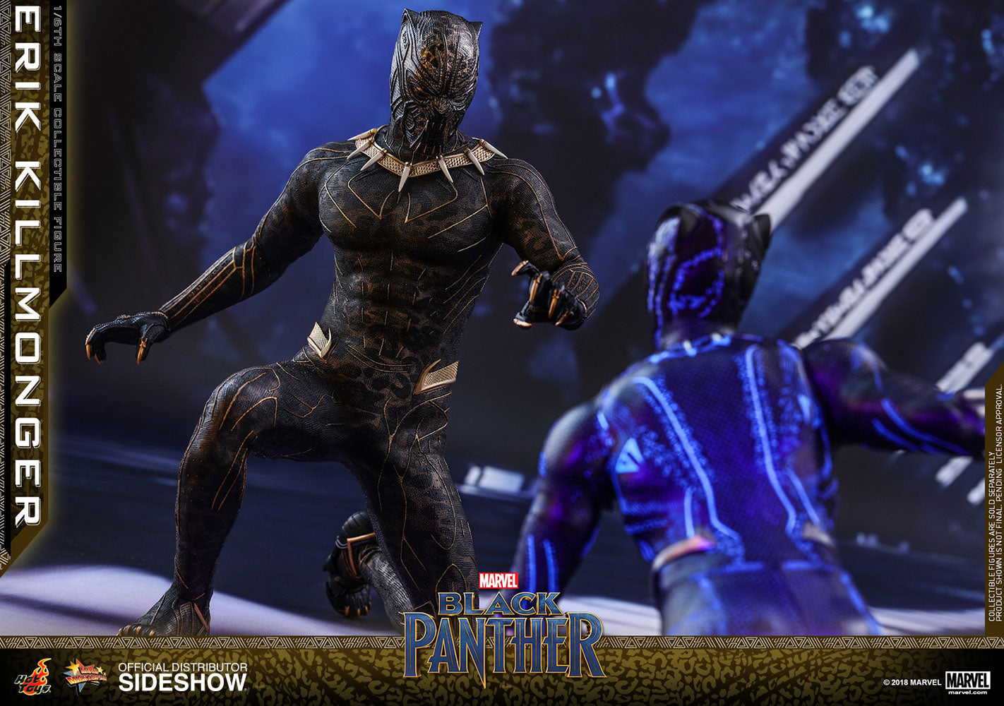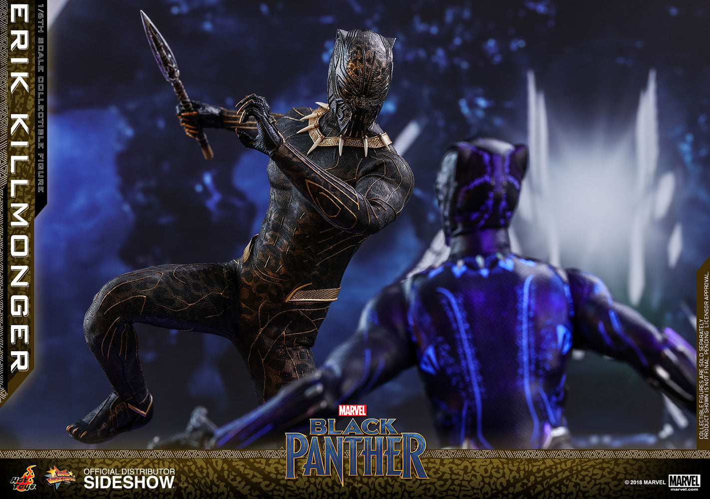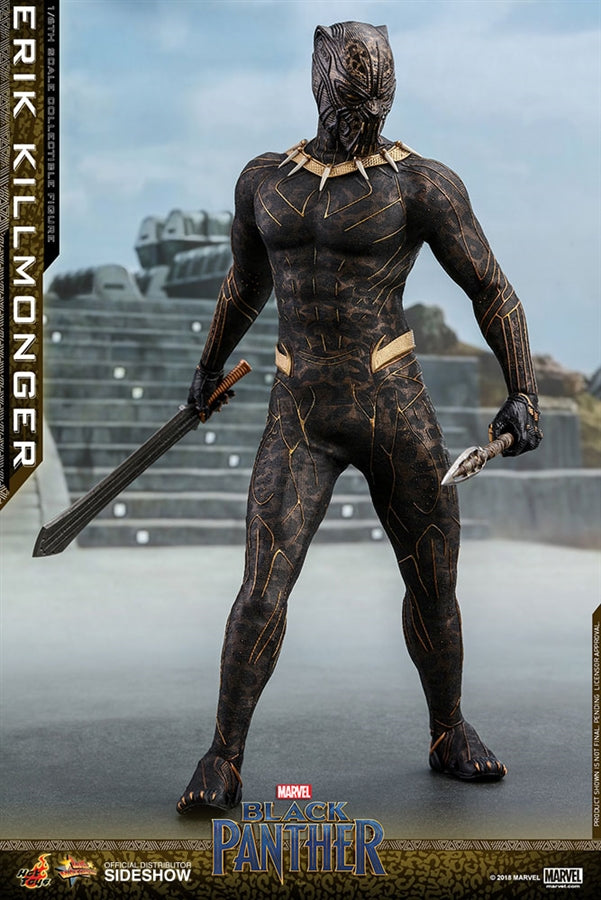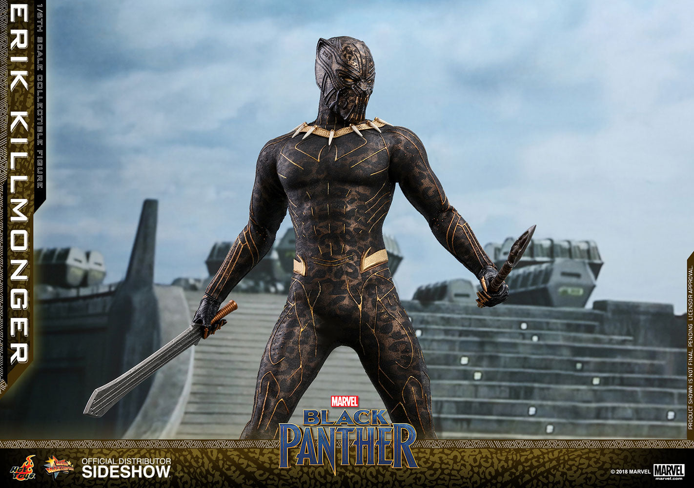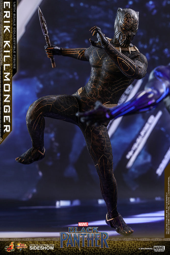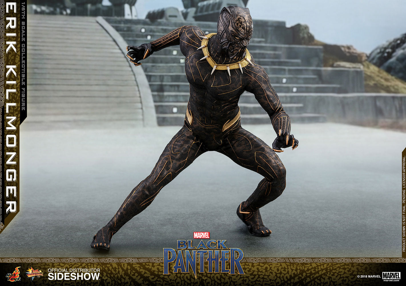 The screenaccurate collectible figure is specially crafted based on the appearance of Michael B. Jordan as Erik Killmonger in the film featuring two interchangeable heads which include a newly sculpted unmasked head sculpt with authentic likeness and all-new masked head with fangs and highly detailed textures, a newly developed muscular body, skillfully tailored Golden Jaguar suit with remarkable tailoring and golden accents, detail recreation of Erik Killmongers weapons, and a specially designed movie-themed figure stand!