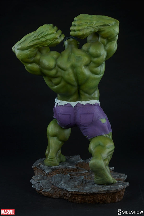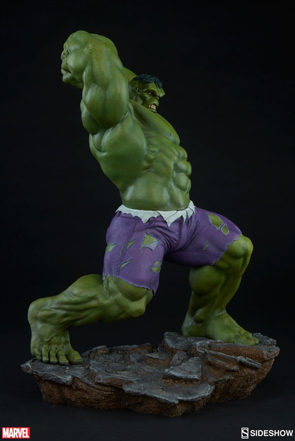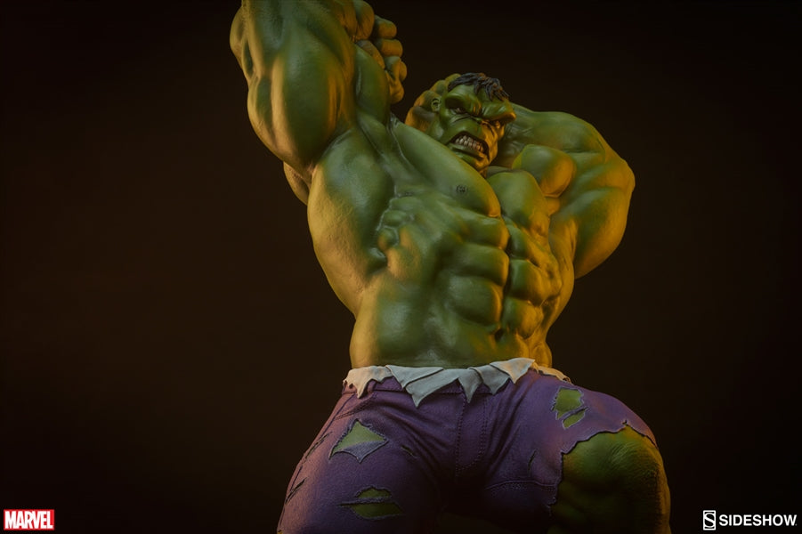 Hulk's great green body has been sculpted with incredible musculature, and even has lifelike skin textures on his elbows and knees. His signature purple pants are intricately sculpted with a detailed, realistic fabric-like appearance as if they are actually tearing as a result of Bruce Banners monstrous transformation.