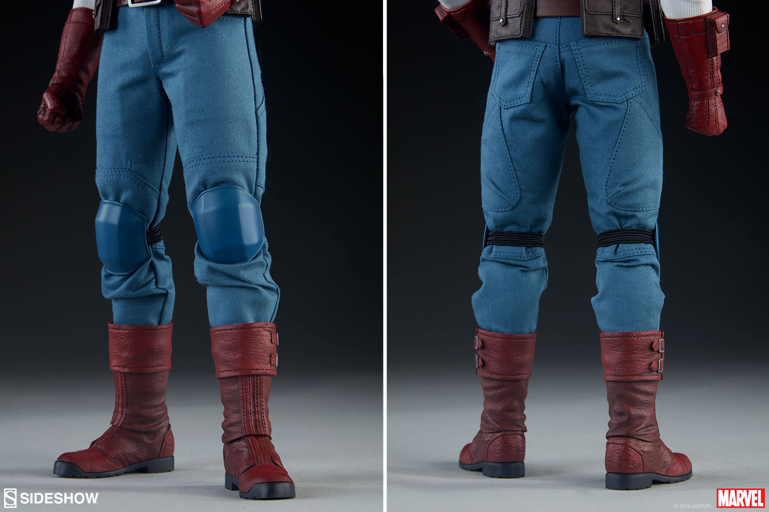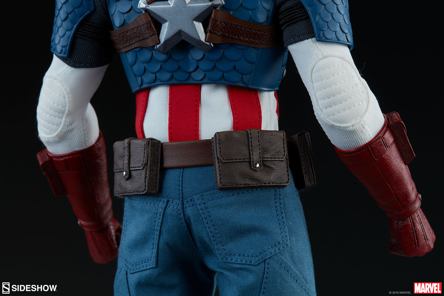 The Captain America Sixth Scale Figure has a custom-tailored fabric uniform in his famous red, white, and blue color scheme, detailed with scaled chest and shoulder armor on his upper torso. The star-spangled Avenger has a belt with pouches, a set of shoulder straps with a magnetic star-shaped shield mount, and magnetic shield mounts in his wrist gauntlets. This highly detailed figure also features a pair of sculpted boots, a pair of kneepads, and seven different gloved hands including a pair of fists, a pair of grip hands, a shield-throwing hand, a relaxed hand, and a salute hand.