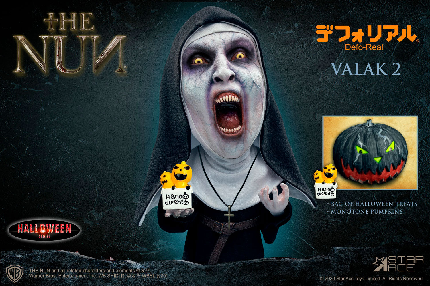 OT-014-184Valak, the demon nun, stalks our nightmares and is even more terrifying on Halloween! This edition features a special bag of Halloween treats and a monochrome jack-o'-lantern. Both versions of The Nun return in these special holiday limited editions.