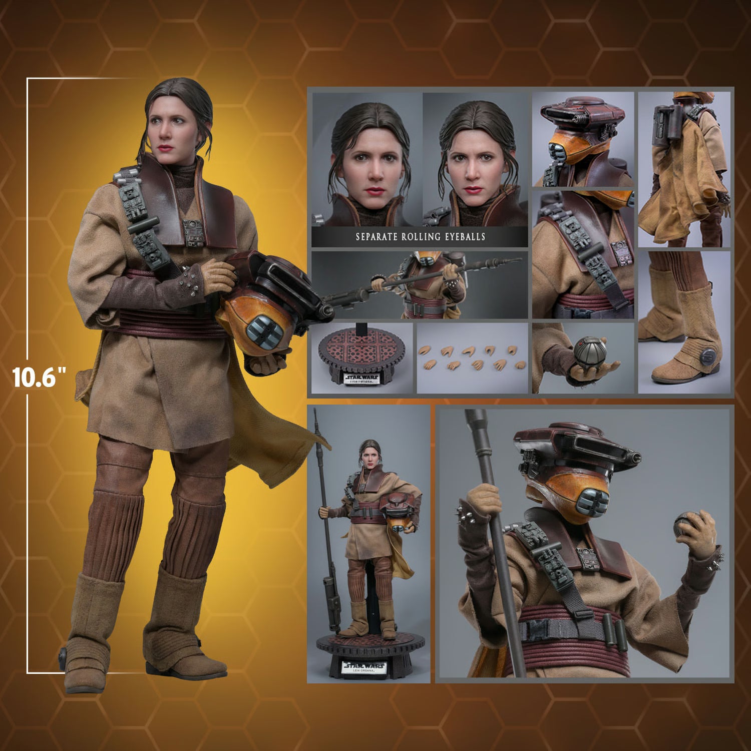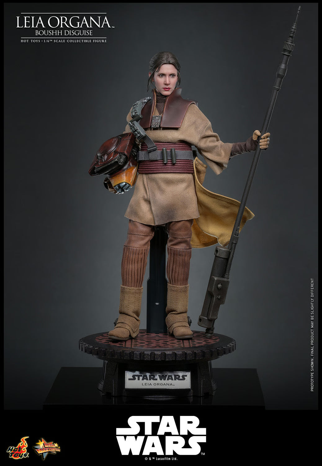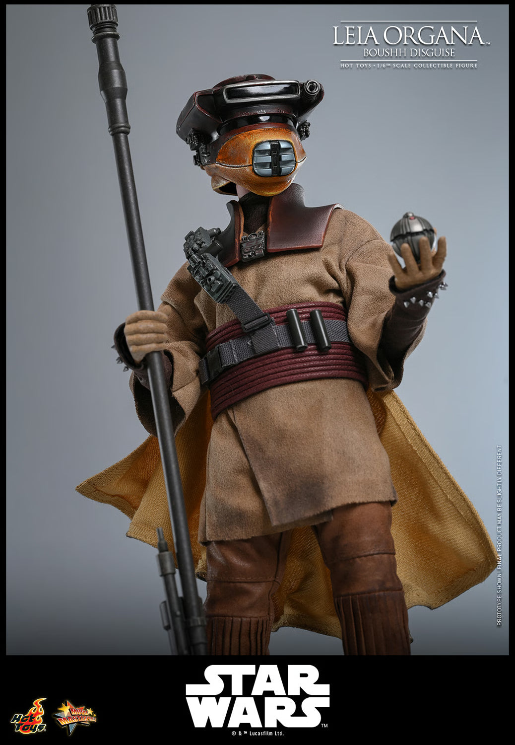 Sideshow and Hot Toys are proud to present the Leia Organa (Boushh Disguise)™ Sixth Scale Collectible Figure. The Star Wars action figure features a newly developed helmeted head with detailed weathering, as well as a separate unhelmeted head sculpt of Carrie Fisher as Leia, complemented by separate rolling eyeballs, a lifelike expression, and a meticulously sculpted low braided bun hairstyle.